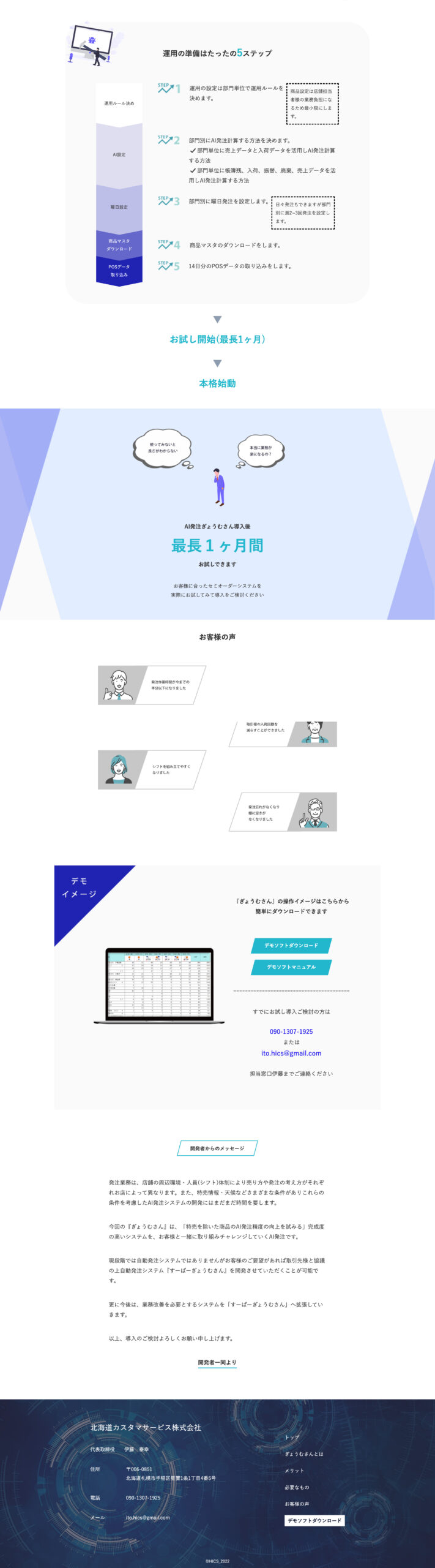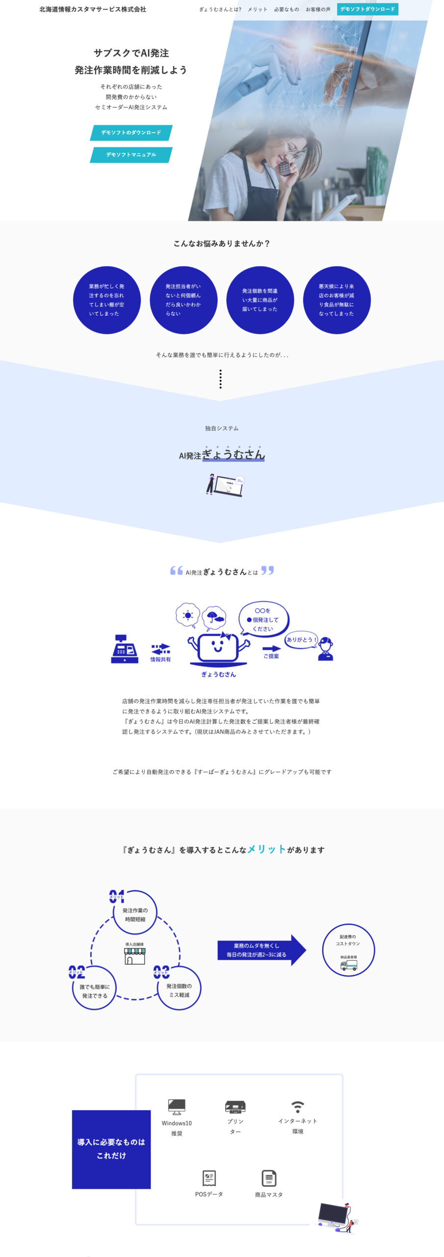 「ぎょうむさん」のサービスをお取引様にわかりやすく説明できるサイトを構築。目的はPCからデモソフトをダウンロードしていただきシステムの利便性を体験していただくことなので、スマートフォンよりもPCでの閲覧のしやすさを重視した。「ぎょうむさん」というシステムをわかりやすく説明するものがなかったため、キャラクターも提案し直感的にどんなシステムかわかりやすいよう構築した。最新システムのサイトであるため、ポイントとなるsectionにはjQueryで動きをつけている。